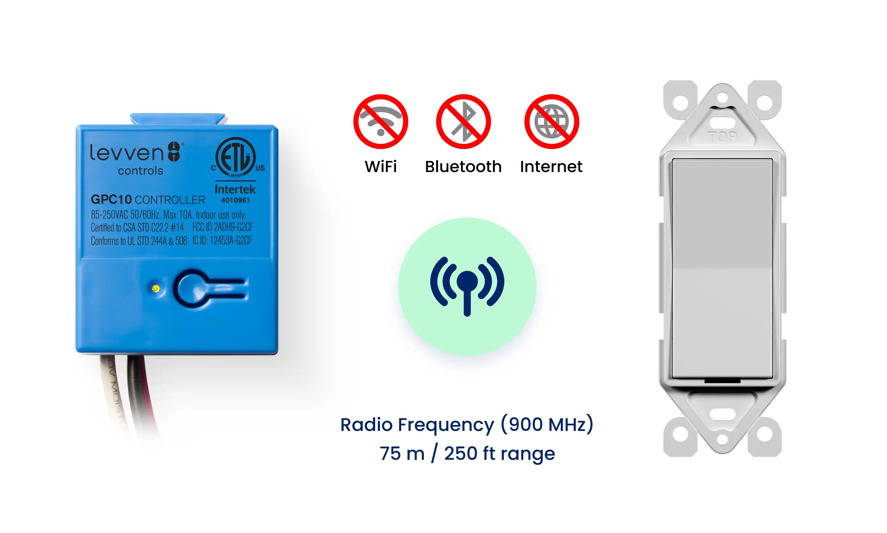 Levven wire-free switches send on, off, and dim commands to power controller(s) using secure 900MHz band radio frequency (RF). The baseline connection is independent of the internet, WiFi, Bluetooth, etc., keeping the homeowners’ Netflix stream lag-free.