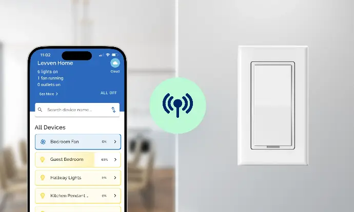 Levven wire-free switches send on, off, and dim commands to power controller(s) using secure 900MHz band radio frequency (RF). The baseline connection is independent of the internet, WiFi, Bluetooth, etc., keeping the homeowners’ Netflix stream lag-free.