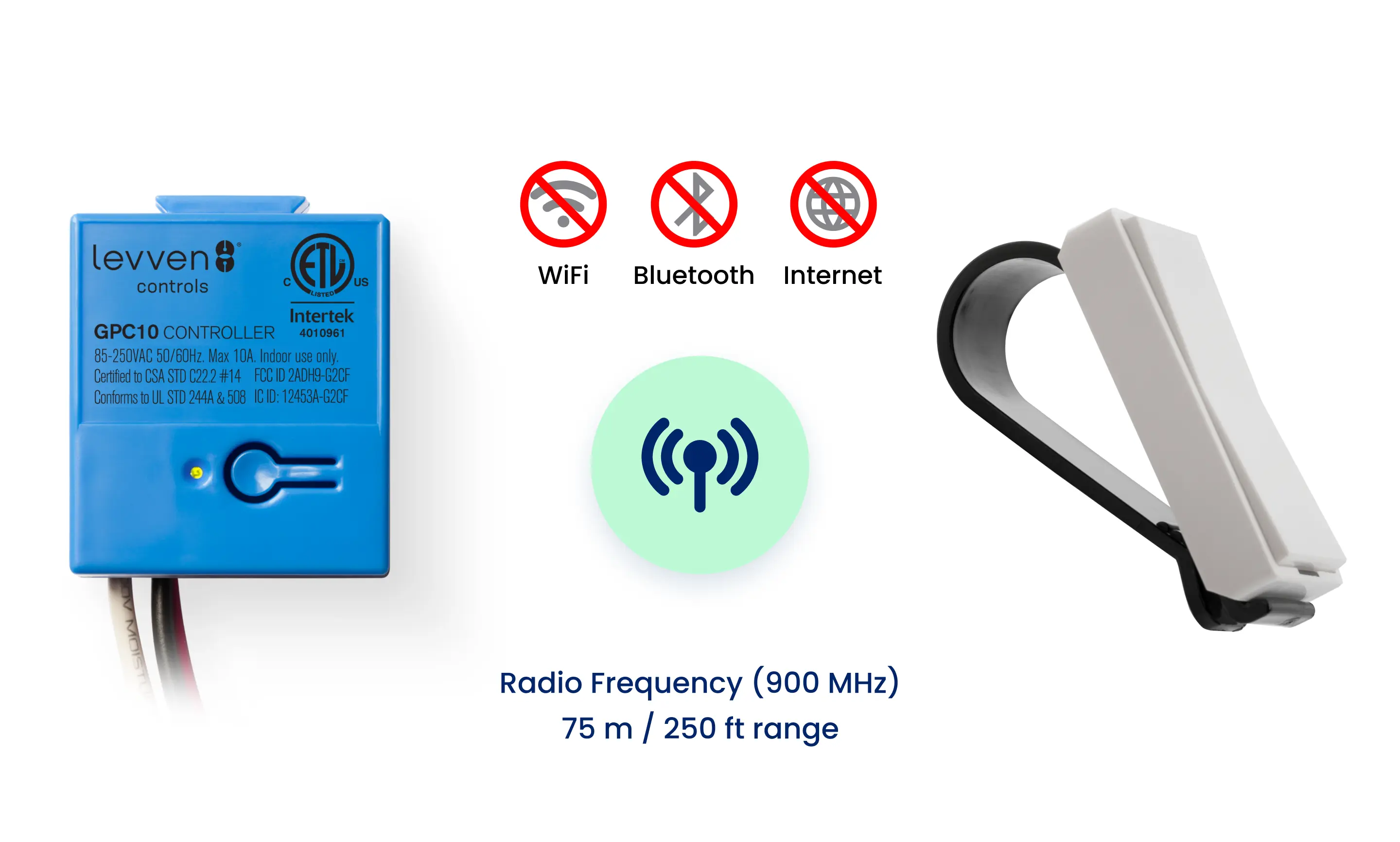 Levven wire-free switches send on, off, and dim commands to power controller(s) using secure 900MHz band radio frequency (RF). The baseline connection is independent of the internet, WiFi, Bluetooth, etc., keeping the homeowners’ Netflix stream lag-free.